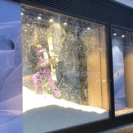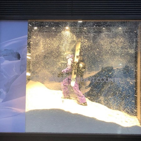 The challenge from a design perspective was to create a powerful feeling of cold and a blizzardy, snowy environment. VGL used a combination of materials to cleverly recreate the storm in the store window: